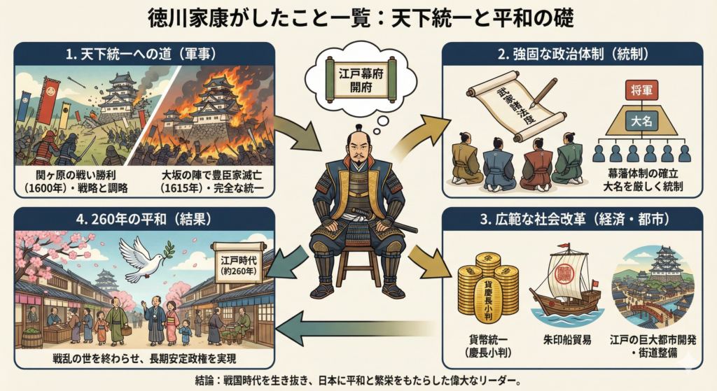 - 徳川家康が生涯で成し遂げた主要な功績と業績の全体像