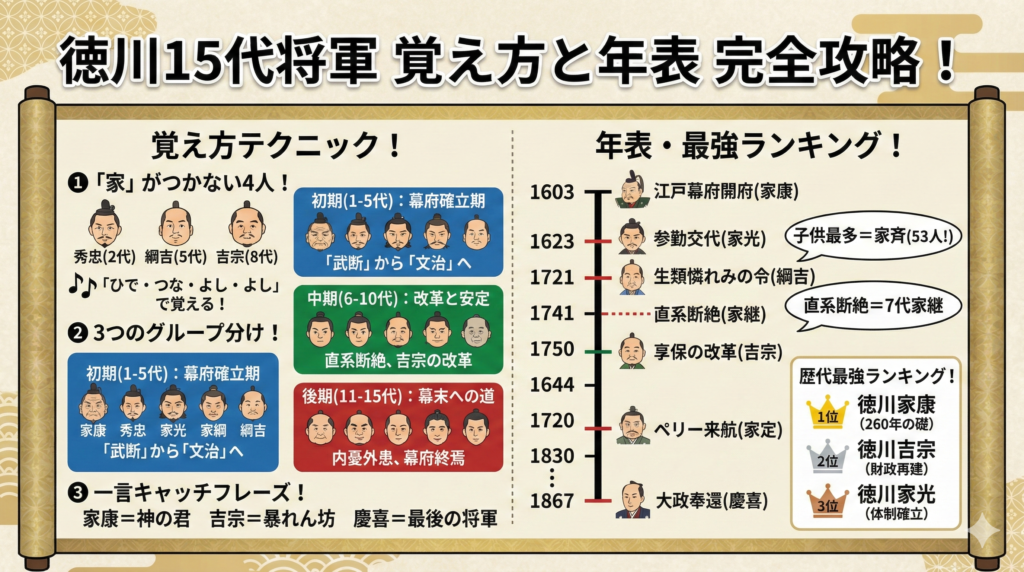 - 語呂合わせやキャッチフレーズで歴代将軍の名前を楽しく覚える方法を伝授