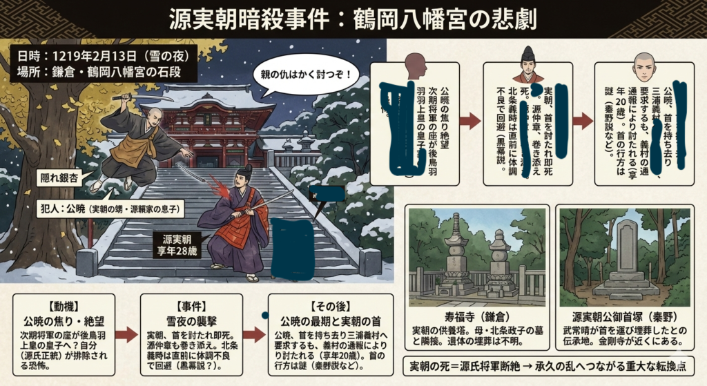 - 源実朝は1219年2月13日、鶴岡八幡宮の石段で甥の公暁によって暗殺された