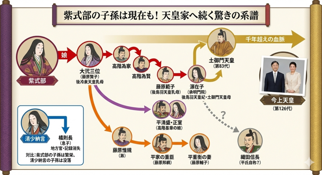 千年前、源氏物語を執筆した一人の女性の血が、娘である大弐三位を通じて天皇家へと流れ込み、現在の今上天皇や愛子さまへと受け継がれています。