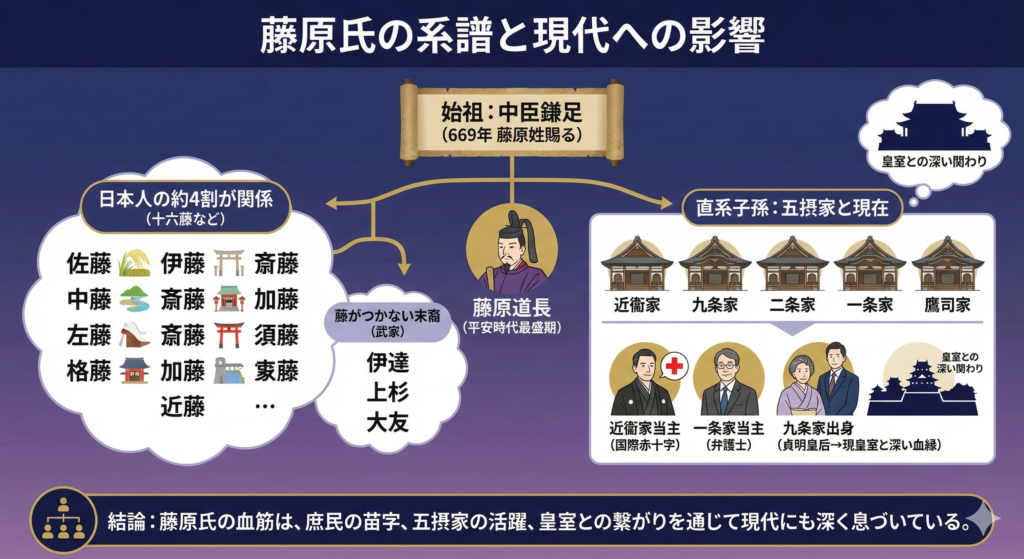 佐藤さん、伊藤さん、加藤さんといった身近な苗字の多くが藤原氏にルーツを持ち、驚くことに日本人の約4割が何らかの形で藤原氏と関係があるとされています。