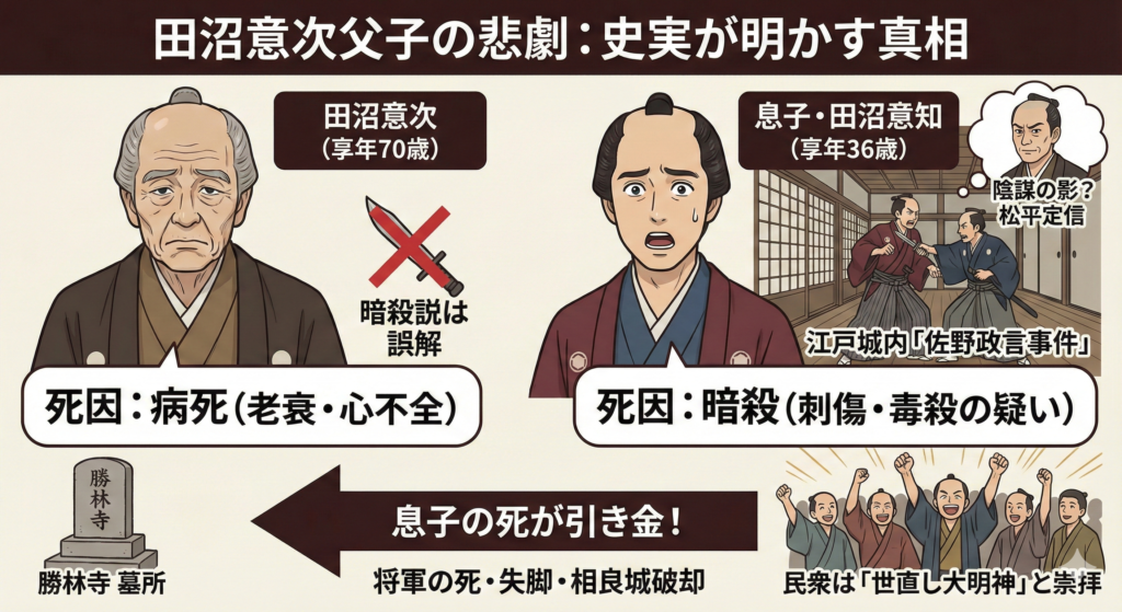 最大の理由は、息子・田沼意知の暗殺事件との混同です。意次の最愛の息子であり後継者であった田沼意知は、実際に江戸城内で旗本・佐野政言に斬りつけられ、命を落としています。この衝撃的な事件が、父である意次の死と混同され、「田沼も殺された」という誤解を生んだ可能性が高いのです。
