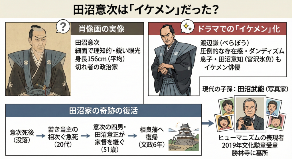 現存する田沼意次の肖像画を見ると、細面の顔立ちで、非常に理知的で鋭い眼光を持った人物として描かれています。決して現代風のアイドル的なイケメンとは違うかもしれませんが、切れ者で威厳のある政治家という雰囲気は十分に伝わってきます。