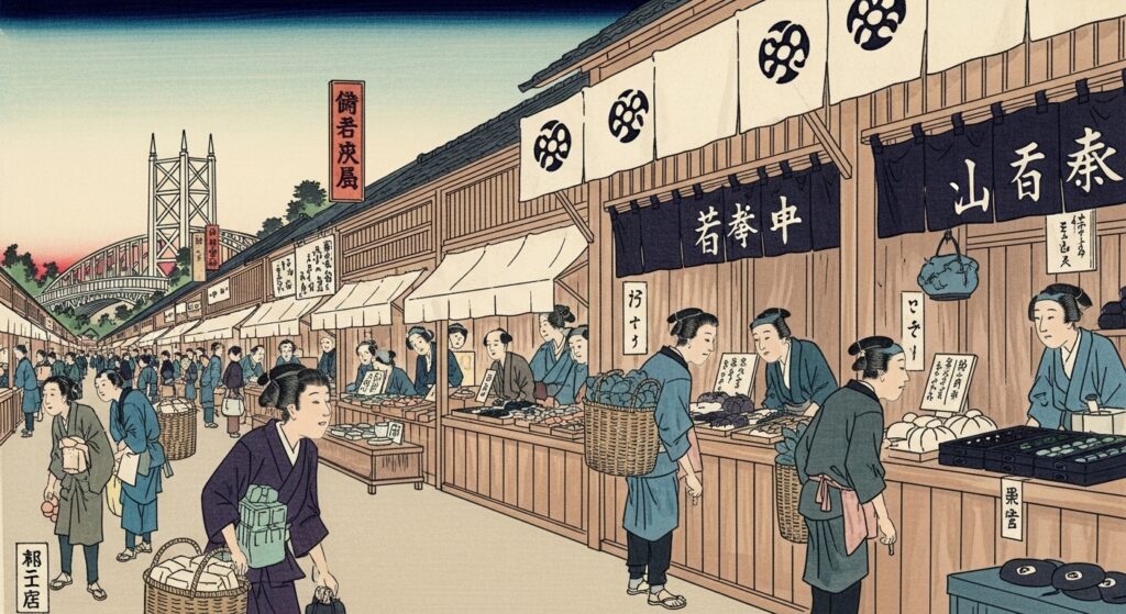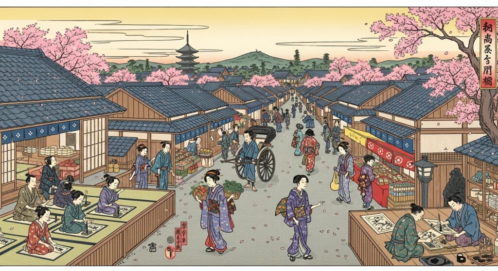 大坂は天下の台所と呼ばれ、全国の米や特産品が集まる経済の中心地でした。各藩は大坂に蔵屋敷を設け、年貢米や特産品を換金しました。京都は天皇と朝廷が存在する伝統的な文化の中心地として、織物や工芸品の生産で栄えました。