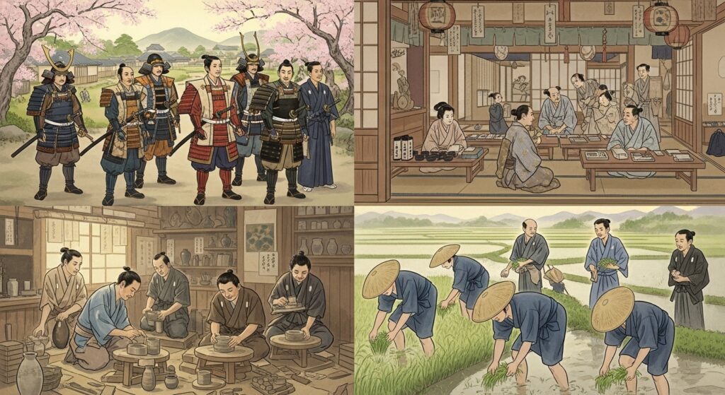 江戸時代には士農工商という厳格な身分制度が確立されました。この制度は、社会を武士、農民、職人、商人の4つの身分に分け、それぞれの役割を固定することで、社会の安定を図ったものです。