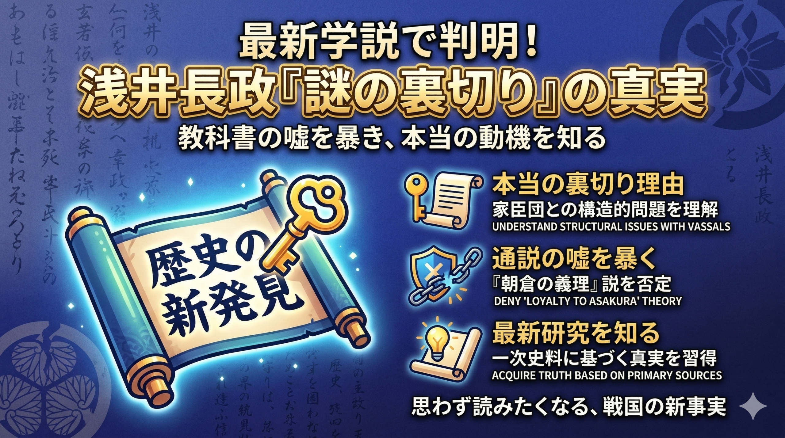 「なぜ長政は信長を裏切ったのか」という問いに対し、教科書的な答えは「朝倉への義理」です。しかし最新の研究はまったく異なる姿を映し出しています。通説の「常識」を一度疑い、史実の核心に迫ってみましょう。