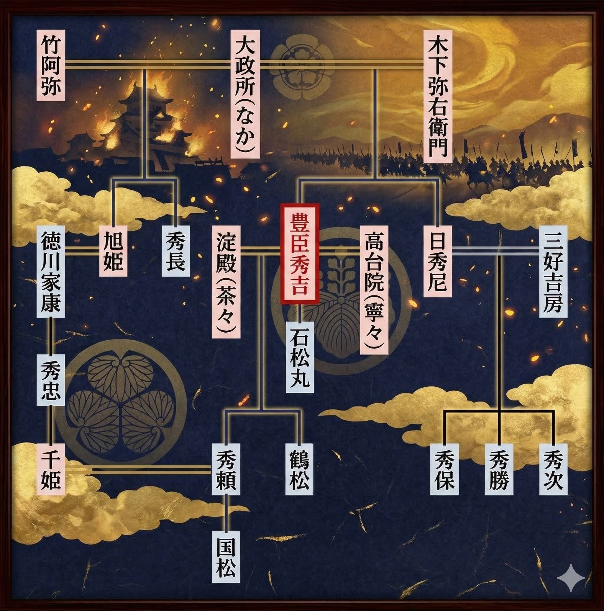 豊臣秀吉には、正室の北政所(ねね/高台院)のほかに、淀殿・松ノ丸殿・三の丸殿・加賀殿など、少なくとも5人以上の妻がいたとされます。当時は「側室」という言葉はなく、北政所を頂点とした序列の中で複数の妻が並立していました。秀吉の妻の総数は文献によって異なり、13人とも20人とも言われています。弟の秀長が史料上確認できる妻2人であったのと比べると、大きな違いがあります。