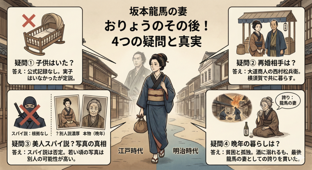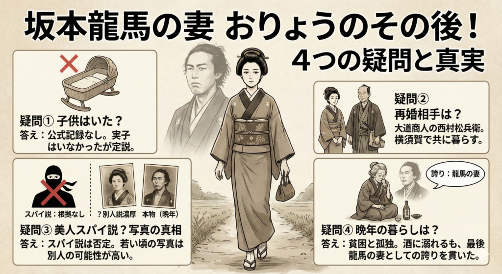 おりょうと龍馬の間に子供はいたのか、再婚相手は誰なのか、美人だったという噂やスパイ説の真相など、気になる疑問がたくさんあります。