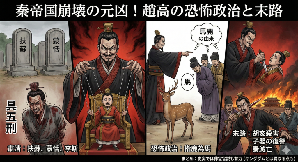 趙高は、鹿と答えた者たちの名前を記録しました。そして後日、これらの正直者たちを謀叛の罪で次々と粛清したのです。真実を語った者が罰せられるという恐怖政治が、ここに完成しました。