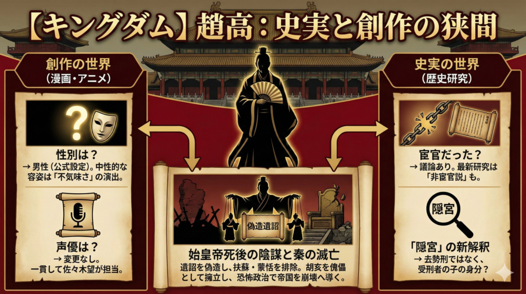 - 史実の趙高が宦官だったかは議論があり最新研究では非宦官説が有力