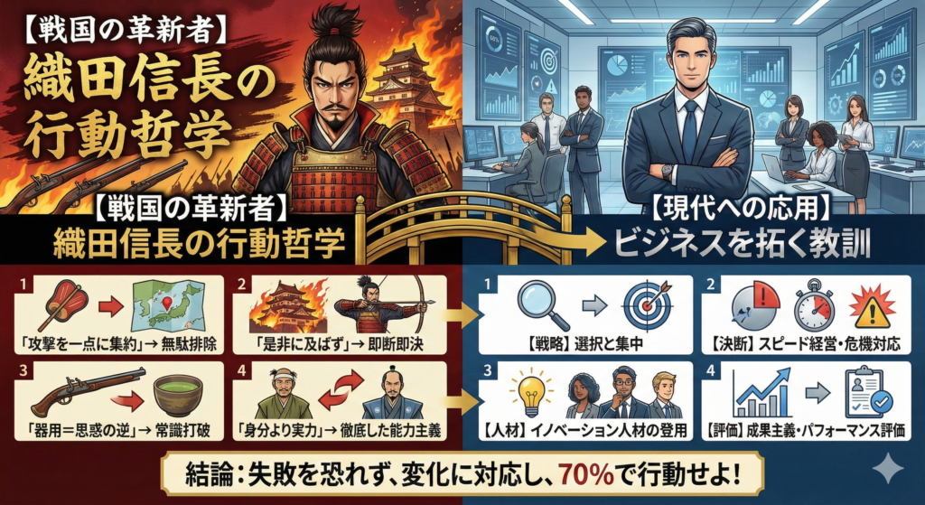 | 行動重視 | 桶狭間での即断即決 | 完璧を待たず70%で行動 |