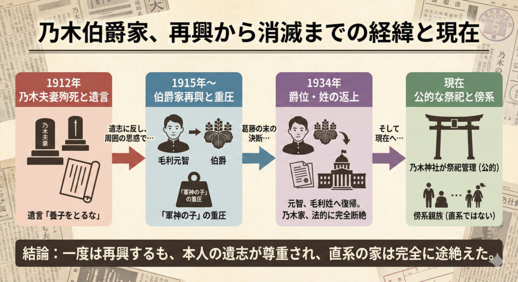 また、前述の通り、一度乃木家を継いだ毛利元智も、1934年に乃木姓を返上して毛利姓に戻っています。その子孫も毛利姓を名乗っており、現在乃木姓を名乗る人物はいません。
