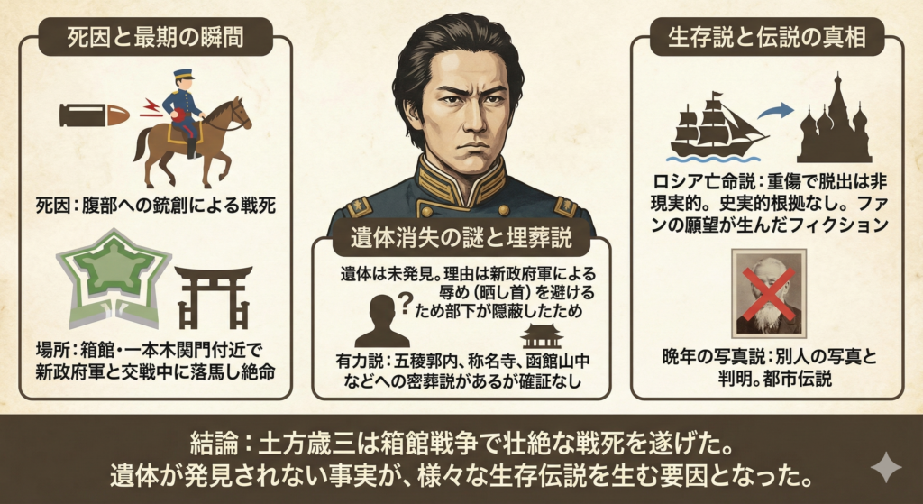 土方歳三にも同様に「実は函館で死なずに生き延びた」という伝説が存在します。この説が生まれた背景には、いくつかの要因があります。