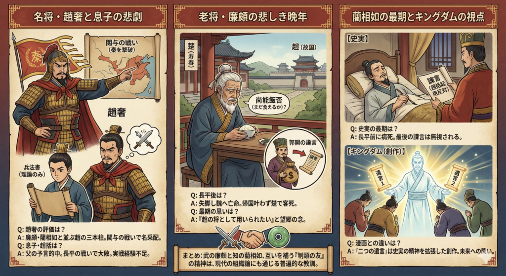 趙奢の死後、紀元前260年の長平の戦いで、趙王は廉頗を解任して趙括を総大将に任命しました。藺相如は病床から膠柱鼓瑟という言葉で諫めました。これは琴の柱を膠で固めて演奏しようとするようなもので、融通が利かないことの喩えです。