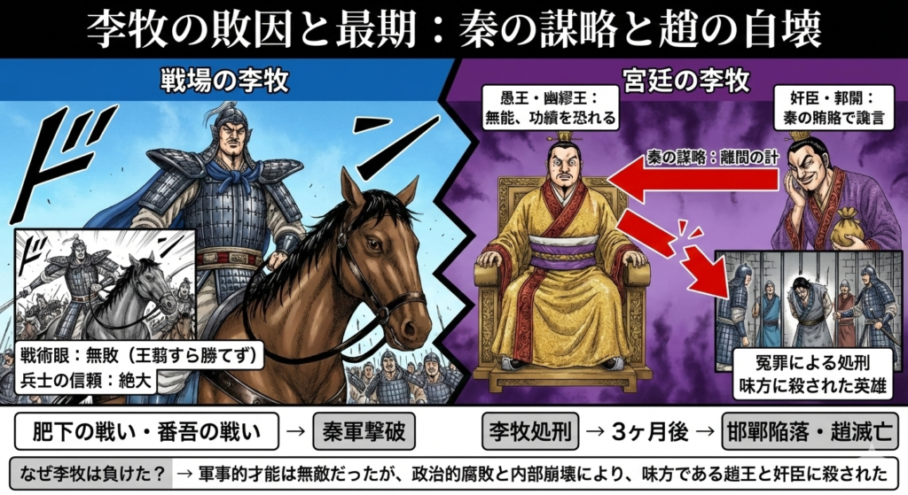 李牧にとって最大の敵は、秦軍ではなく自国の政治体制でした。特に幽繆王という暗愚な君主と、郭開という腐敗した権力者の存在が、李牧の運命を決定づけたのです。