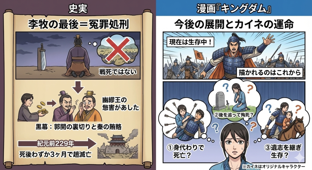 - 漫画キングダムでの李牧の死亡シーンはまだ描かれておらず今後の展開であること